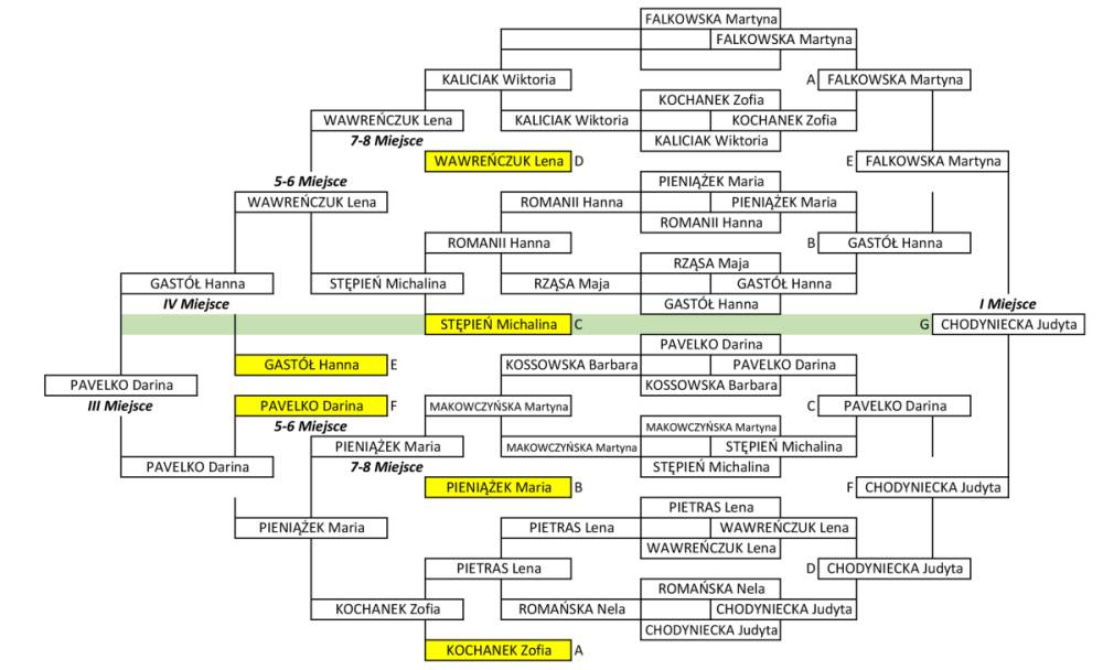 Wśród dziewcząt walka była zacięta i pełna niespodzianek. Judyta Chodyniecka okazała się najlepsza, zdobywając pierwsze miejsce. Martyna Falkowska zajęła drugą pozycję, a Darina Pawelko stanęła na trzecim stopniu podium.